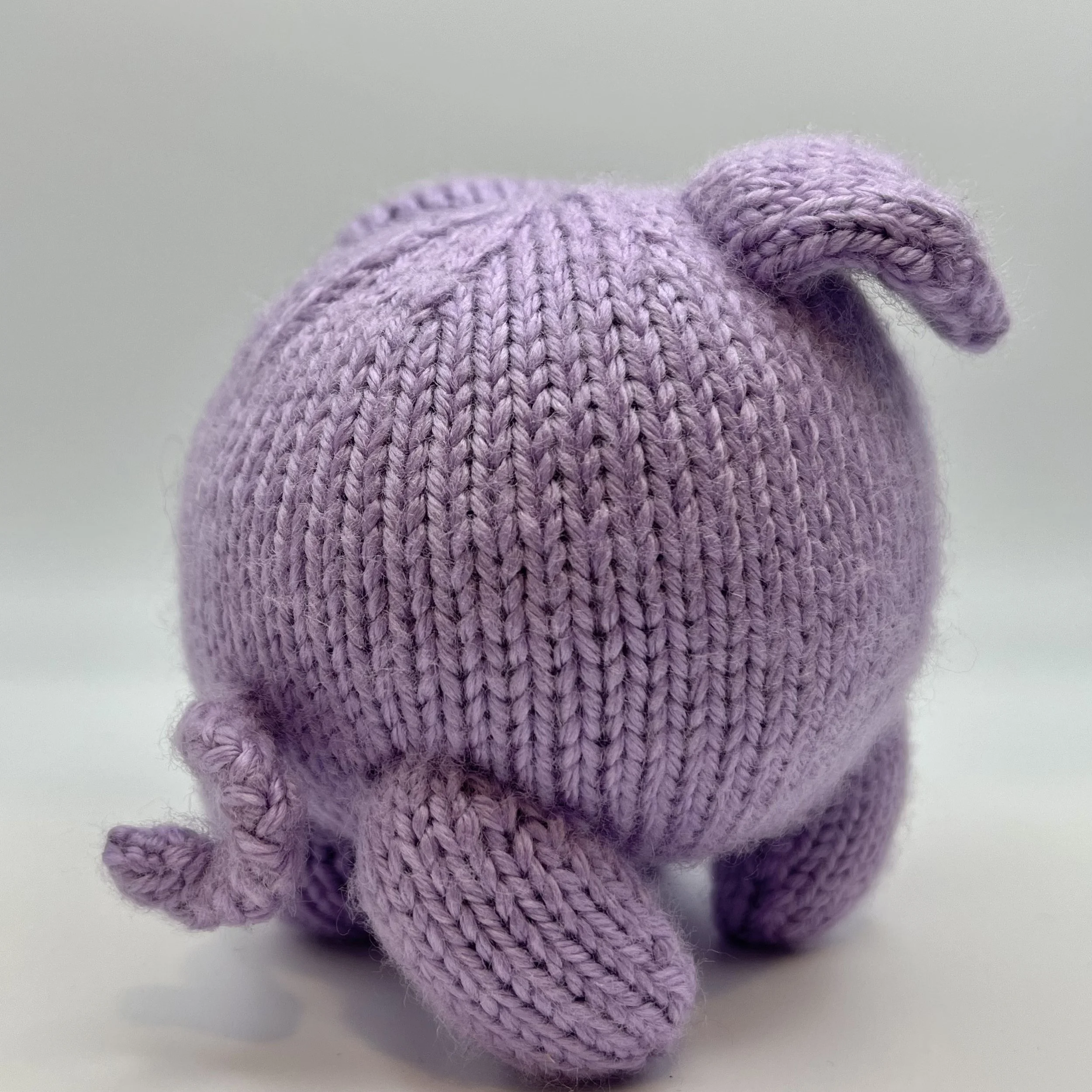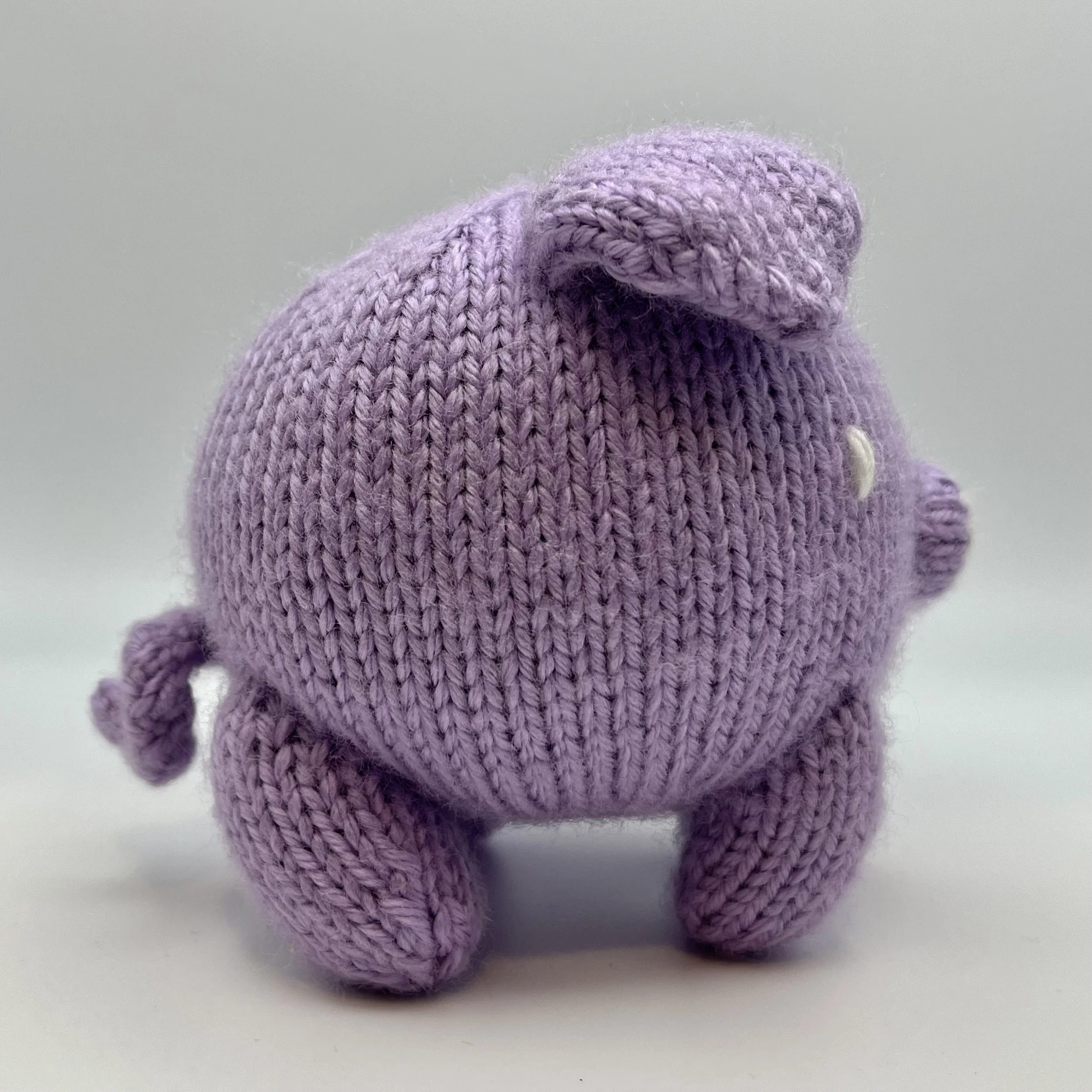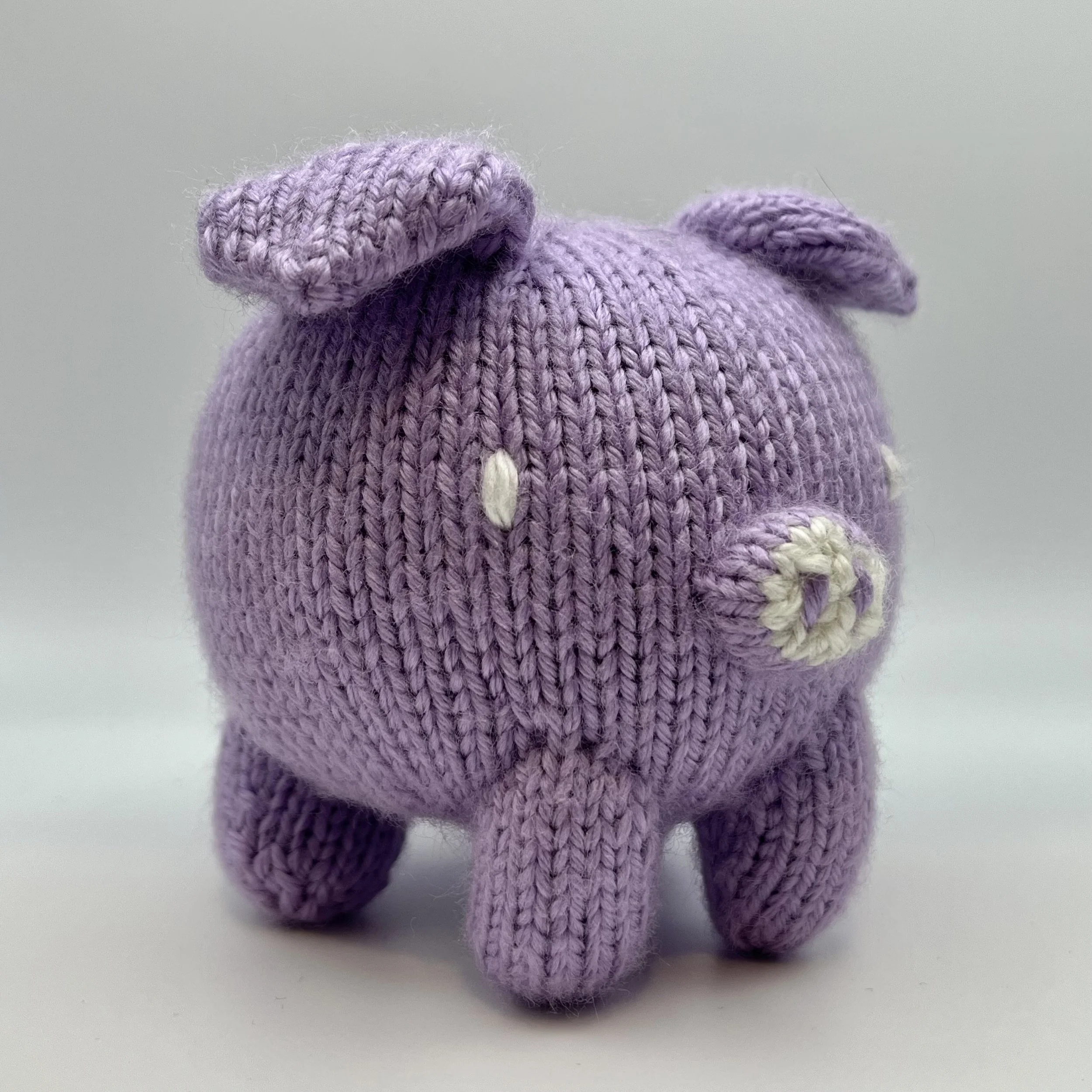 This knitting pattern creates a little pig stuffed animal with a curly tail, approximately 3.5 inches tall and 9 inches in circumference.