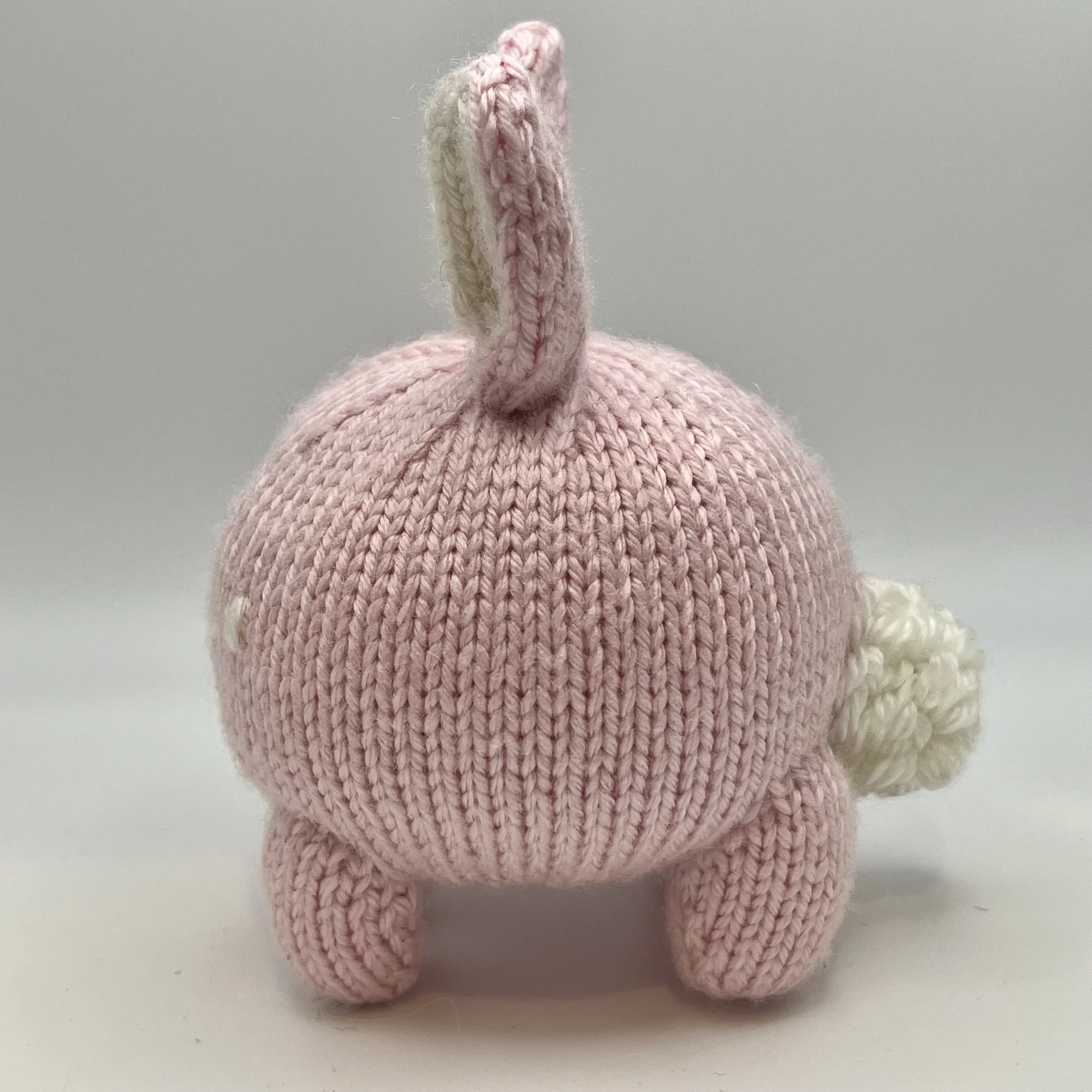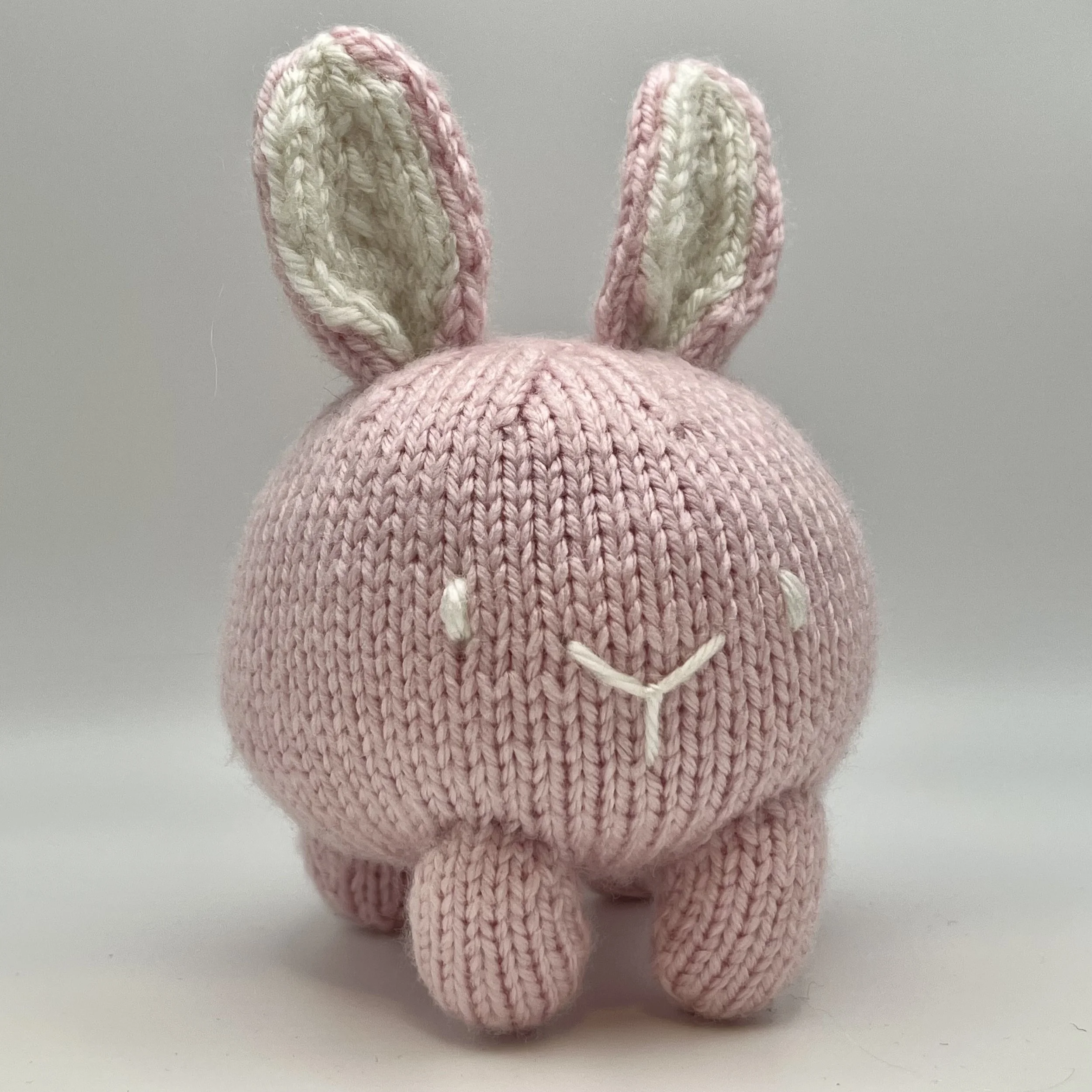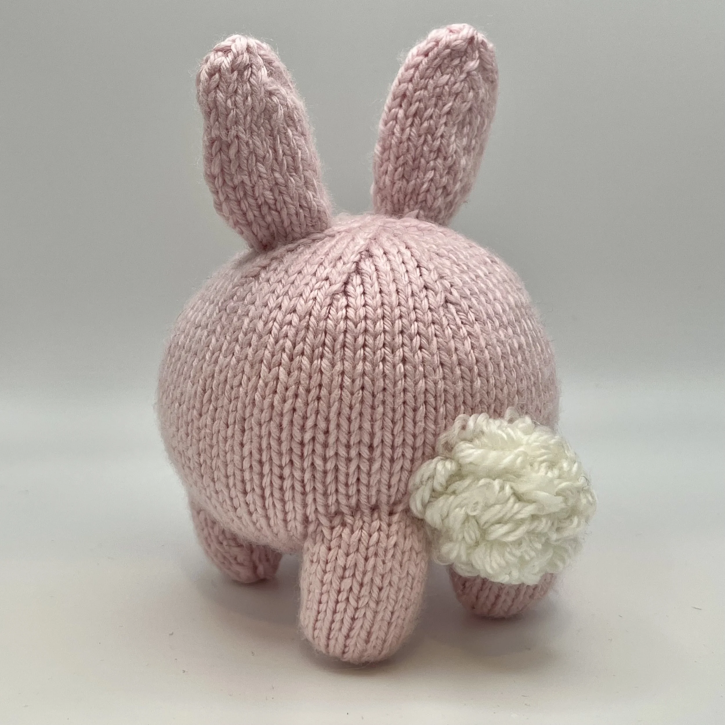 This knitting pattern creates a little rabbit stuffed animal with a fluffy tail and tall ears, approximately 4 inches tall and 9 inches in circumference.